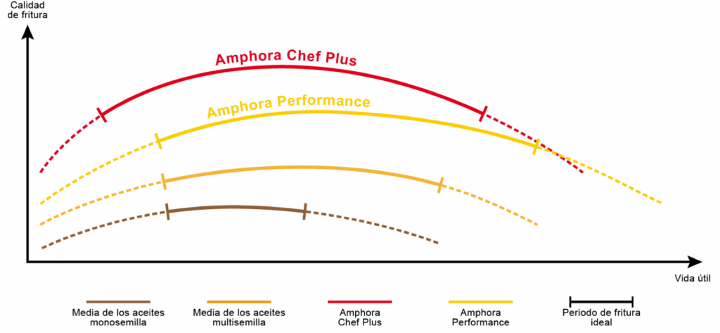 Amphora Performance y Chef Plus prolongan la vida útil del aceite de fritura hasta un 64% y un 79% más que otros aceites profesionales.